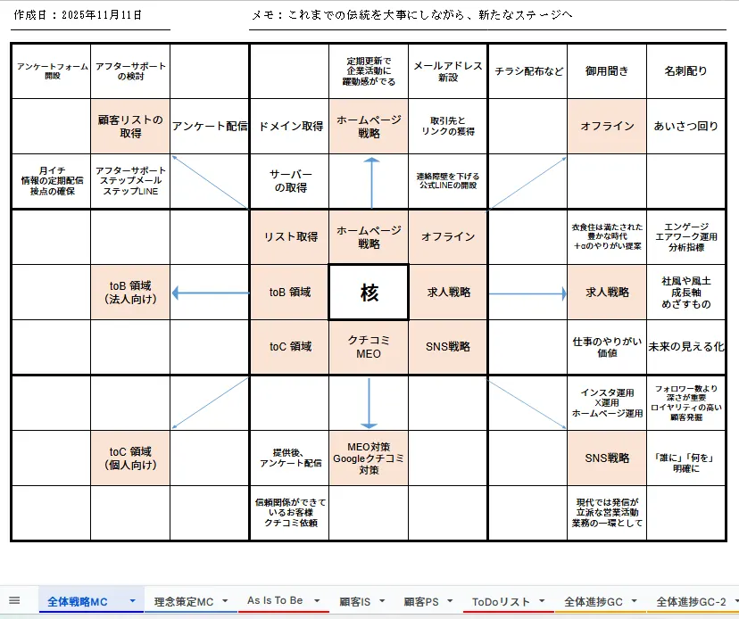 理念(核)をベースとした、全体の包括的な戦略を構築する事で、ブレない軸のもと強い推進力が生まれるのです。